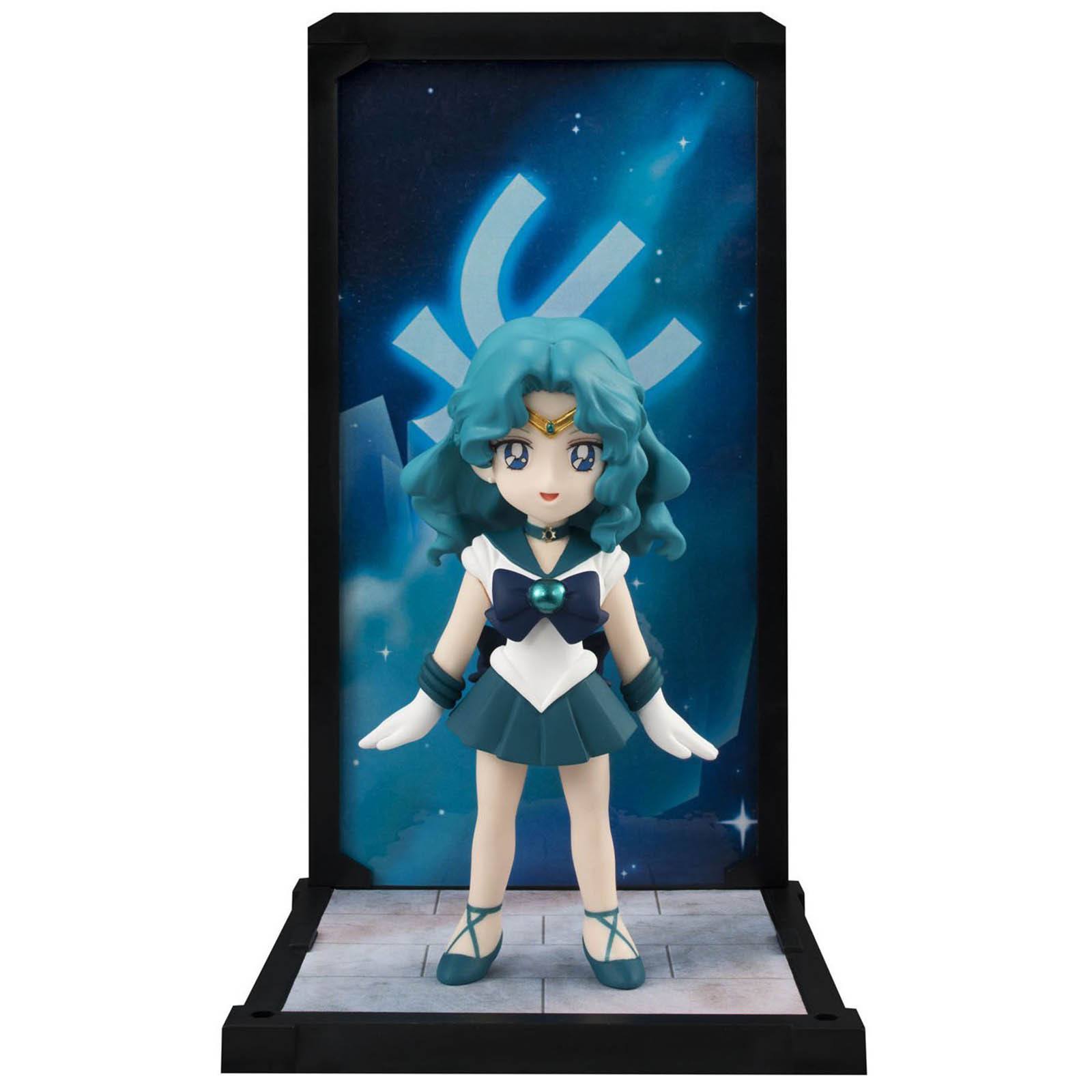 The Neptune Tamashii Buddies figure stands roughly 4 inches tall and the background display stands about 6 inches tall. The Sailor Moon Buddies figure has no articulation and it's a static figure.