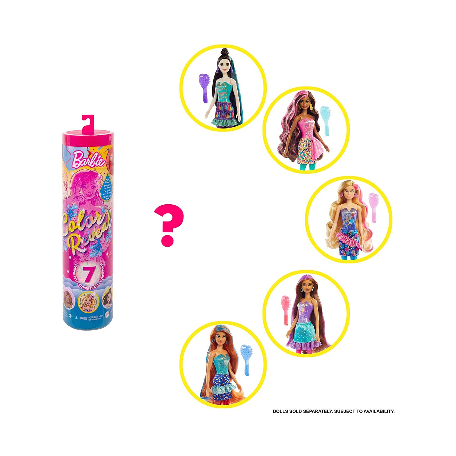 Swirl this Barbie in warm water to reveal its fun look! With 7 surprises in 1 package, the Barbie Color Reveal dolls deliver all kinds of delight.