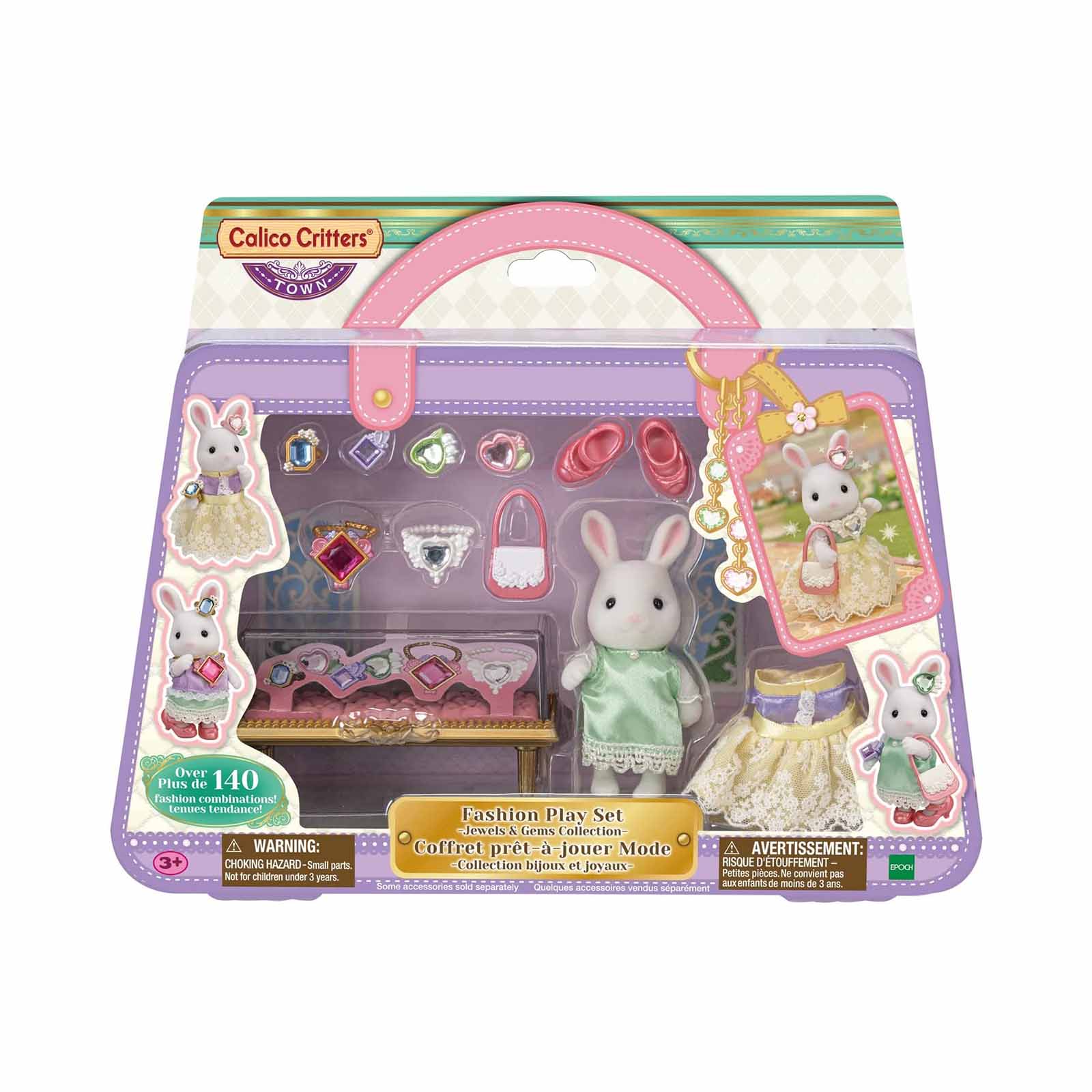 Play dress up with the Fashion Playset Jewels & Gems Collection featuring Snow Rabbit Older Sister! Mix and match the fashion accessories to create unique outfits for her to wear. Ready to play playset includes 3 inch Snow Rabbit Older sister who is poseable and dressed in removeable clothing. Set includes 13 pieces including a display case, handbag, pair of heels, blouse and skirt and jewel and gems to accessorize with! Play together with other Fashion playsets and items from Calico Critters Town Series.