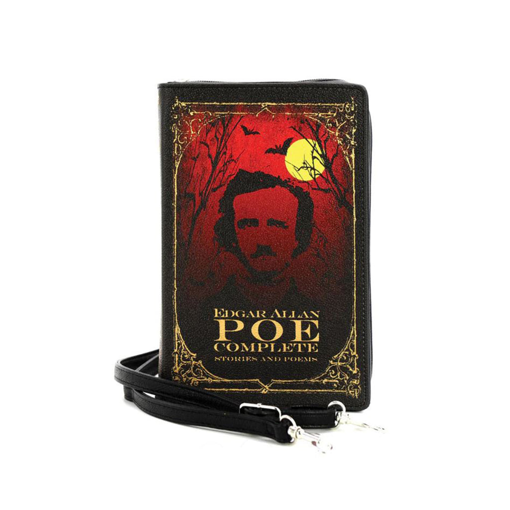 Introducing the Comeco Edgar Allan Poe Book Clutch Black Vinyl Bag Purse, a unique and stylish accessory for anyone who loves classic literature and quirky designs.