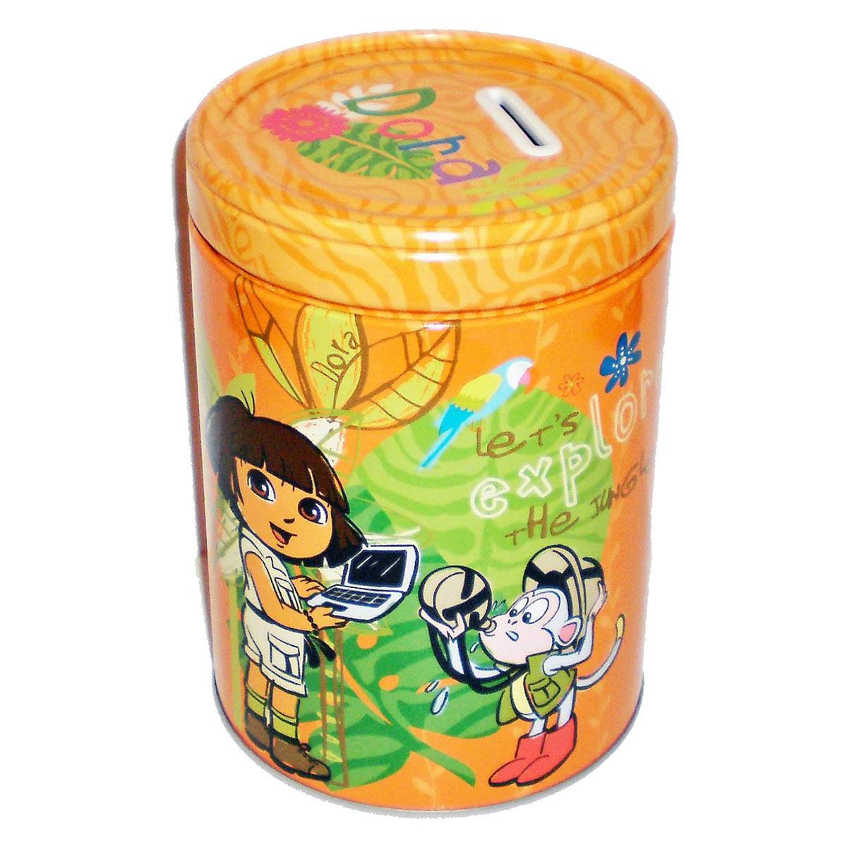 This is a Dora the Explorer Jungle Explorer Round Tin Piggy Bank. The Dora the Explorer Piggy Bank is made by The Tin Box Company. It features a cool wrap around graphic and comes with an easy-off lid for coin retrieval. The Dora the Explorer Jungle Piggy Bank is a great way to encourage kid's to start saving, or it's just a great little container.