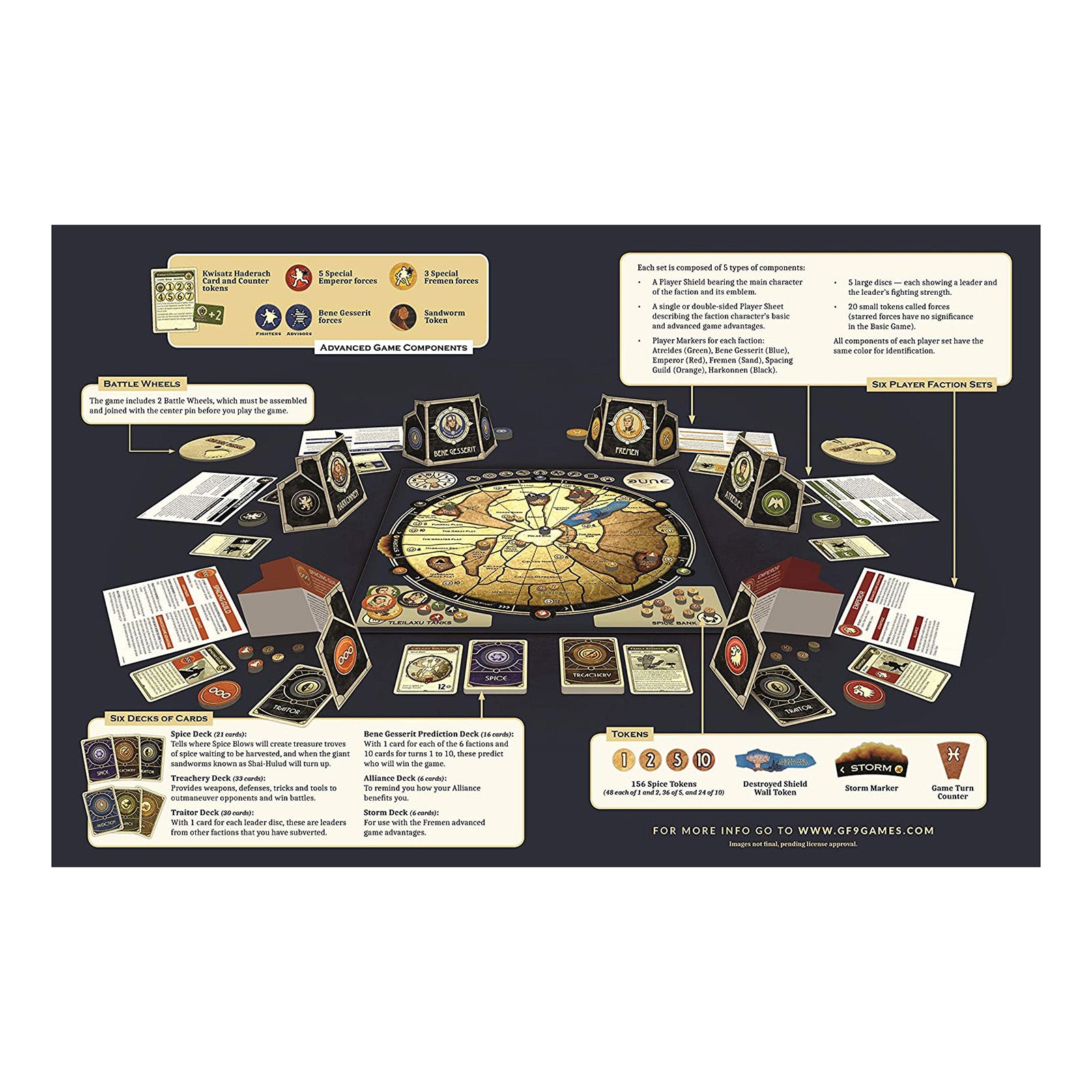 This game comes with the following components: A beautiful map of Arakis, 6 Player shields, 6 Player sheets, 2 Battle wheels, 119 Cards, 324 Tokens, and a rulebook with quick start guide.