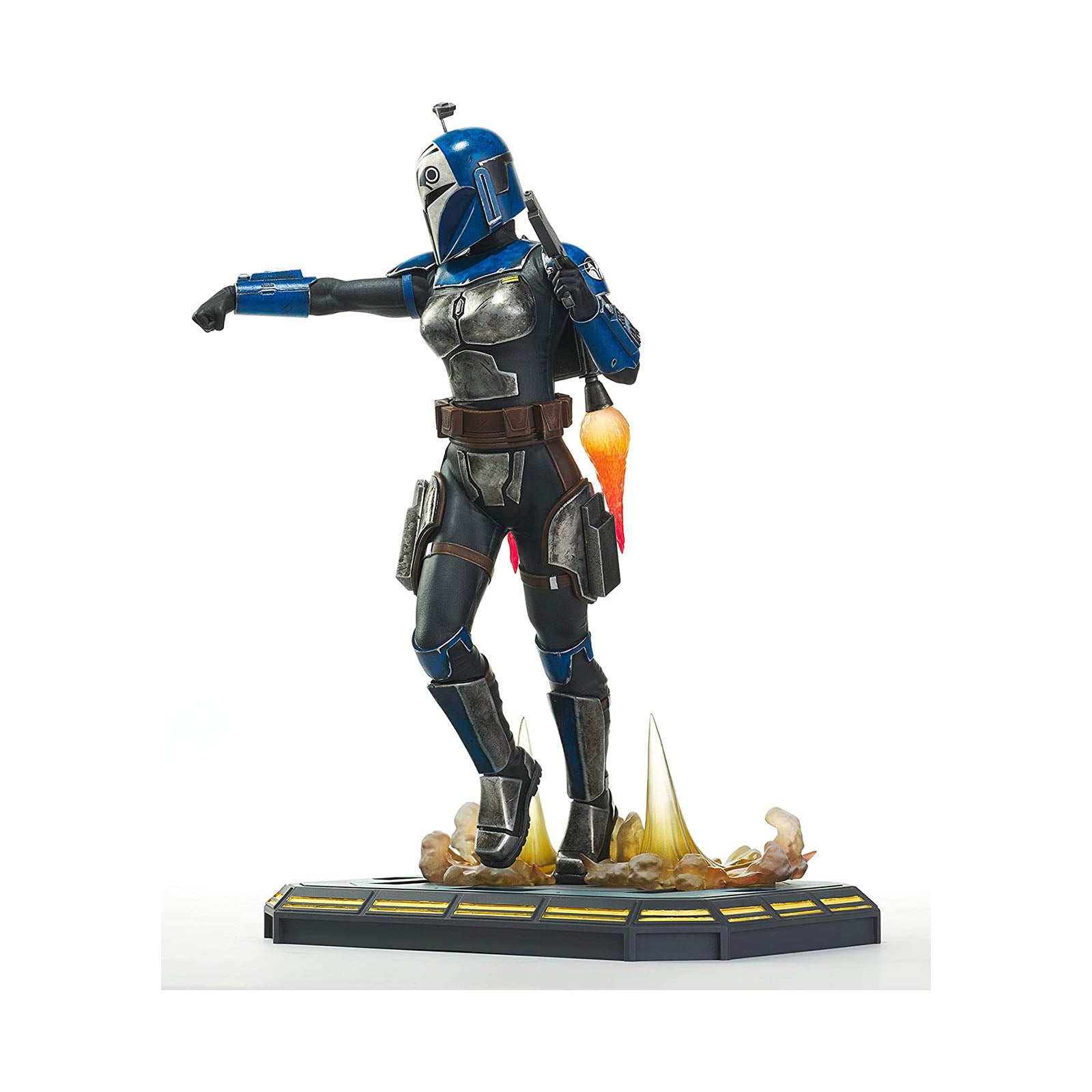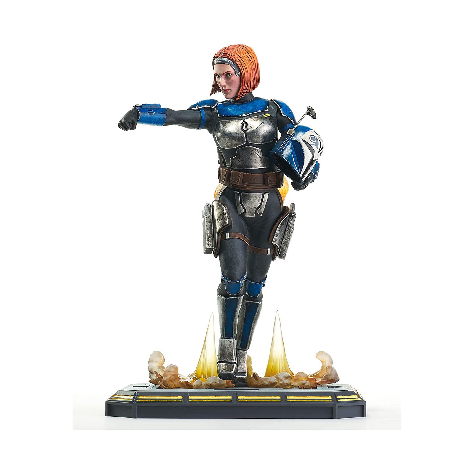For the glory of Mandalore! Mandalorian freedom fighter, Bo-Katan Kryze, blasts her way into the Premier Collection! Featuring interchangeable heads, she can be displayed with her helmet on or off. Bo-Katan can also hold her helmet or blaster with alternate arms. Bo-Katan engages her jetpack and measures approximately 11-inches tall.