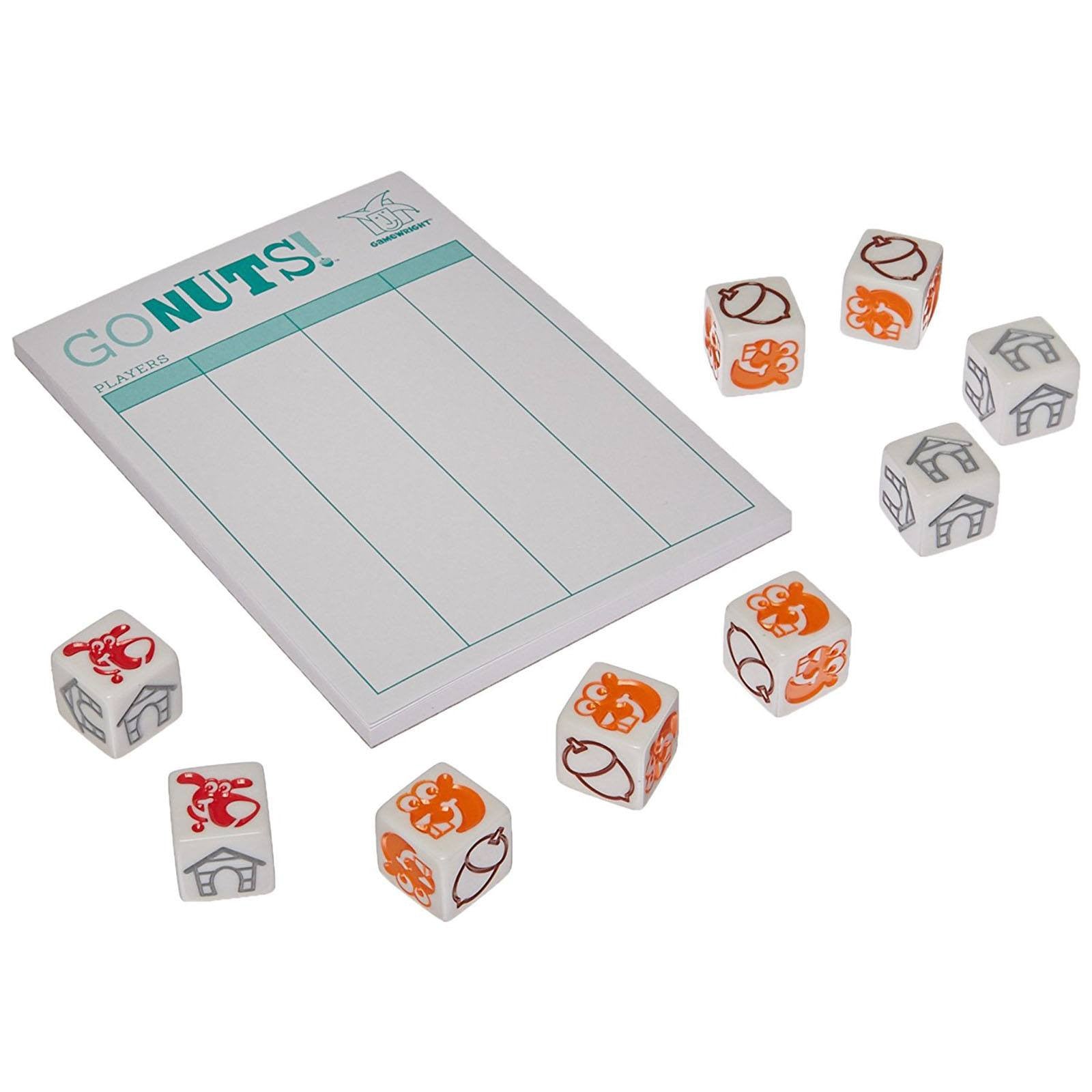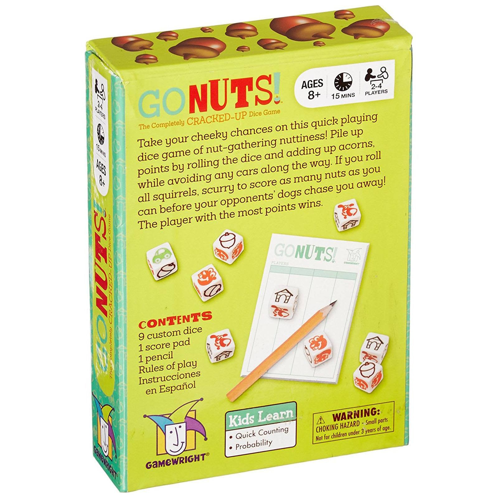 Go Nuts! is a fast paced, and dare we say, nutty game. It's a dice rolling game that is full of action, squirrels gathering nuts, and avoiding cars. Yes, avoiding cars! That's kind of an issue right there. In Go Nuts! you roll dice, get nuts, and go a little crazy. Go Nuts! has won a landslide of awards for it's pure fun factor. Good price point and a unique little dice-rolling game.