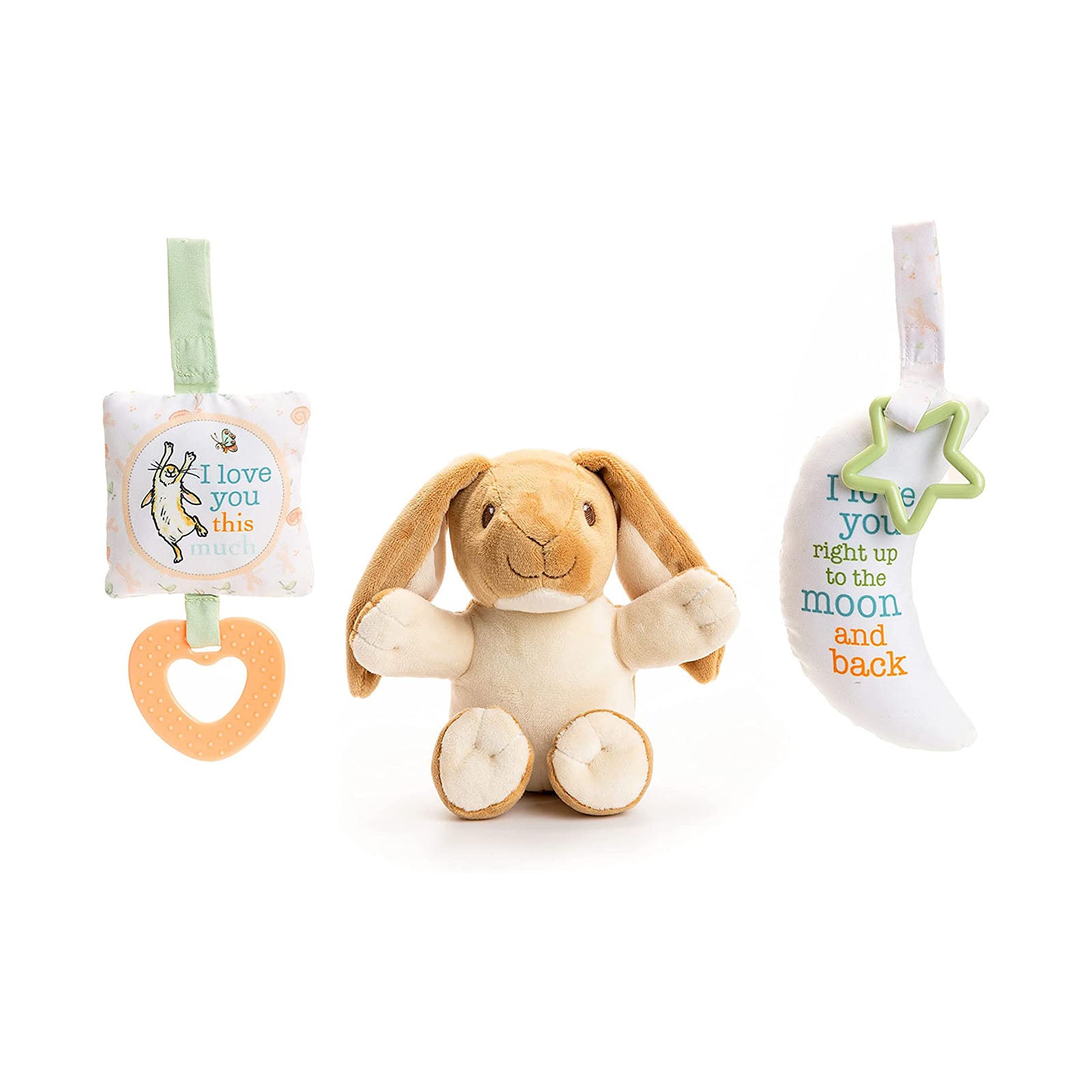 The set includes a bunny plush figure and two teething toys.