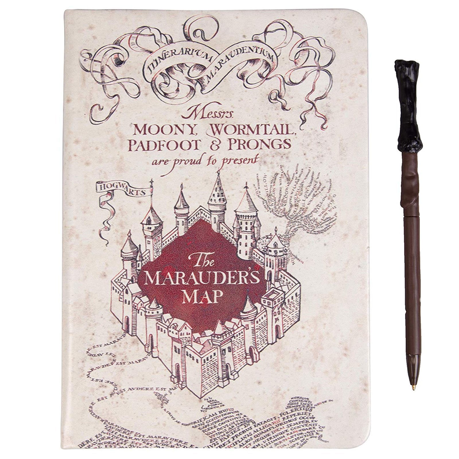 This journal measures roughly 8.5 inches tall and 6 inches wide. The 192-page book features a faux leather hardcover featuring the iconic Marauder's Map from Harry Potter.