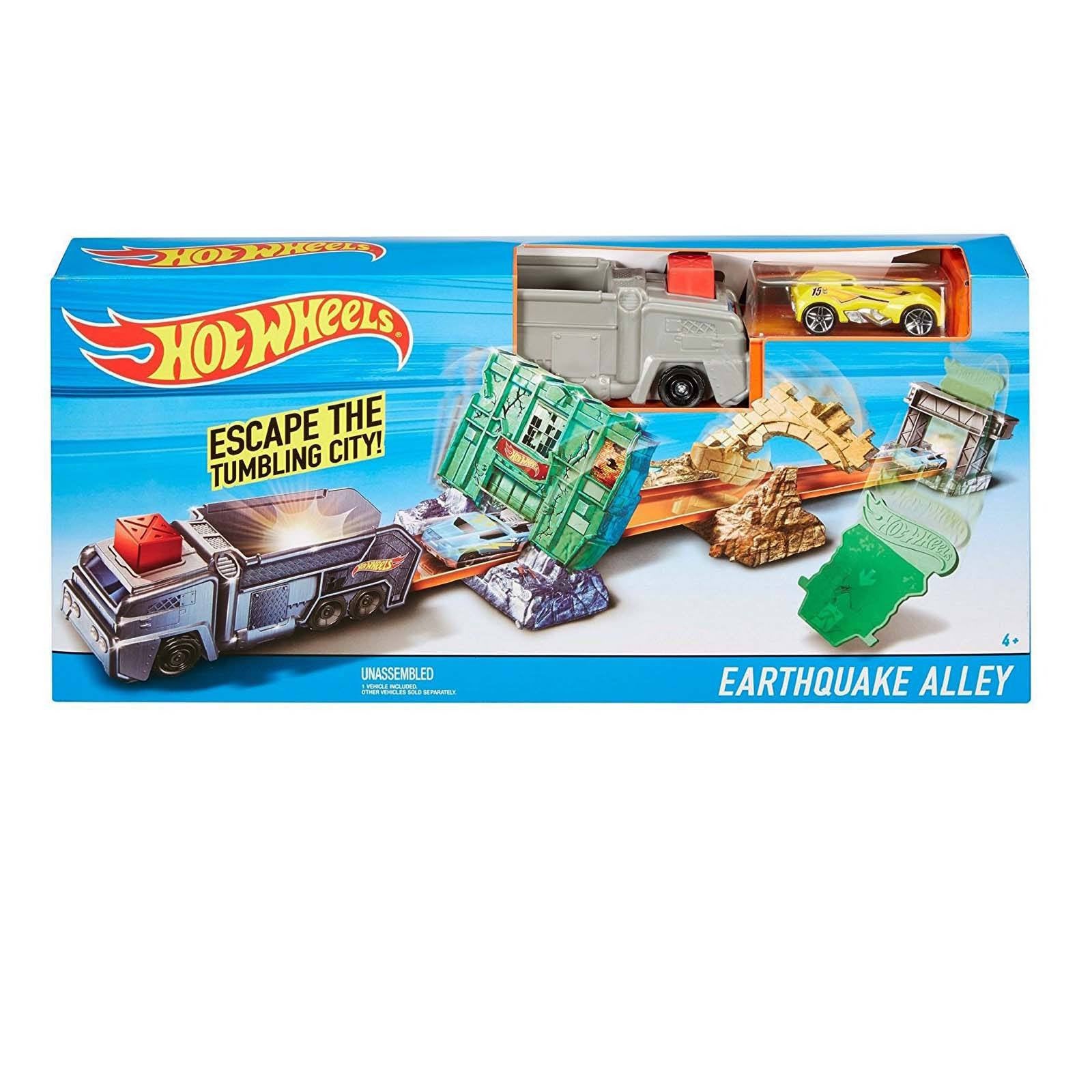 The gist of the Hot Wheels Earthquake Alley Track Set is to make an escape from the tumbling city.
