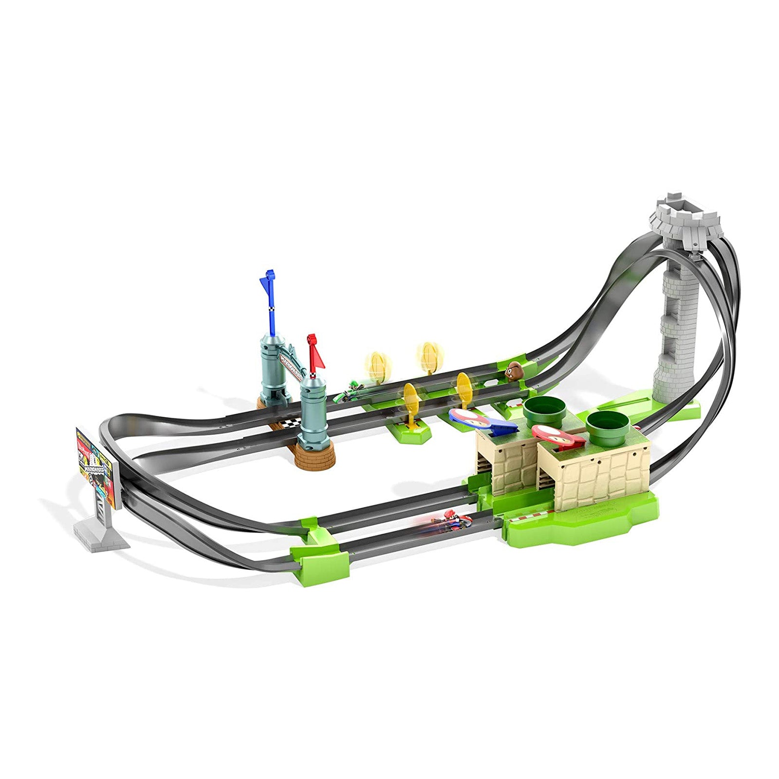 The Hot Wheels Mario Kart Mario Circuit Lite Track Set is a fun, castle themed playset. It features an upside down tower, spinning coins, and a slam launcher.