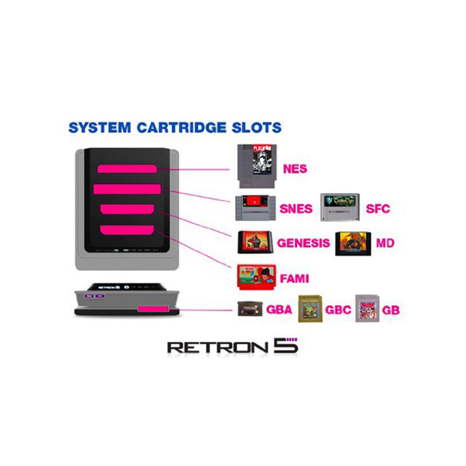 The RetroN 5 plays Game Boy® , Game Boy Color®, Game Boy® Advance, Famicom™, Super Famicom™, Nintendo® Entertainment System, Super Nintendo® Entertainment System®, Sega Genesis®, and Mega Drive cartridges with enhanced resolution, improved interpolated sound, screenshot capture, and the ability to have on the fly save states. The RetroN 5 is the retro gaming console that brings you back to a world where recharging health is cheating, you can have as many guns as you want, and achievements aren't just some numbers on a screen.