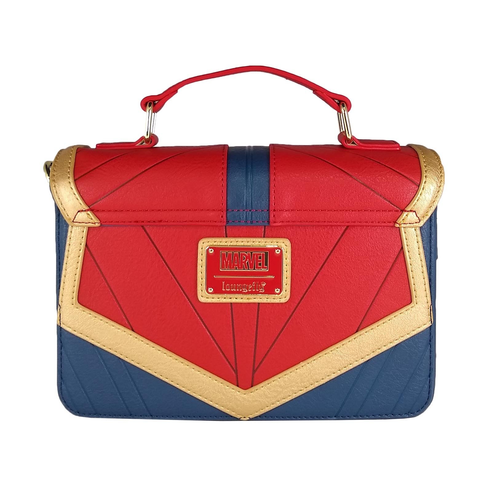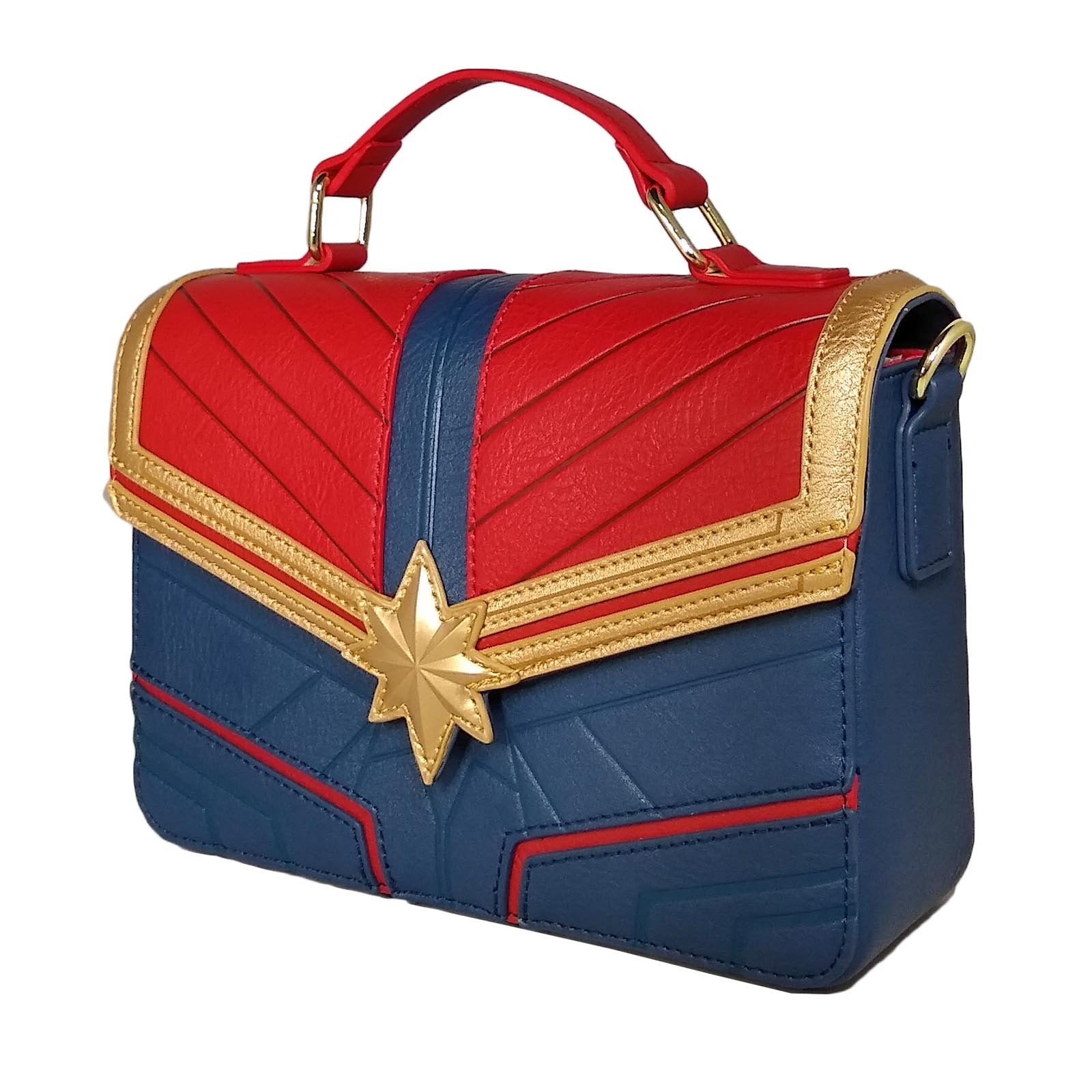 This is a Captain Marvel Debossed Suit Crossbody Bag produced by the good people over at Loungefly.