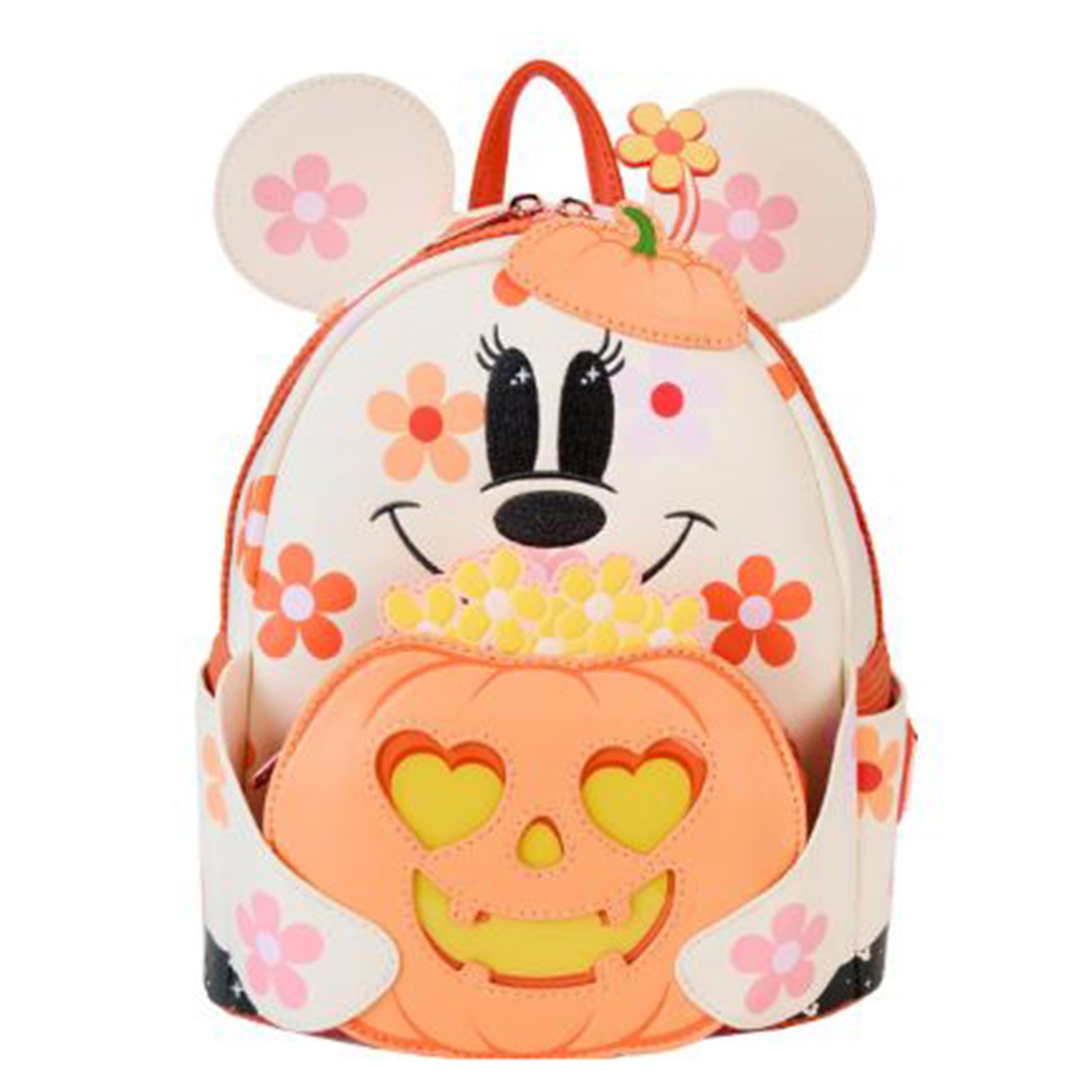 Minnie Mouse Halloween Theme: The backpack showcases Minnie Mouse dressed in her adorable Halloween costume, complete with festive colors and spooky details, capturing the fun and whimsy of the season.