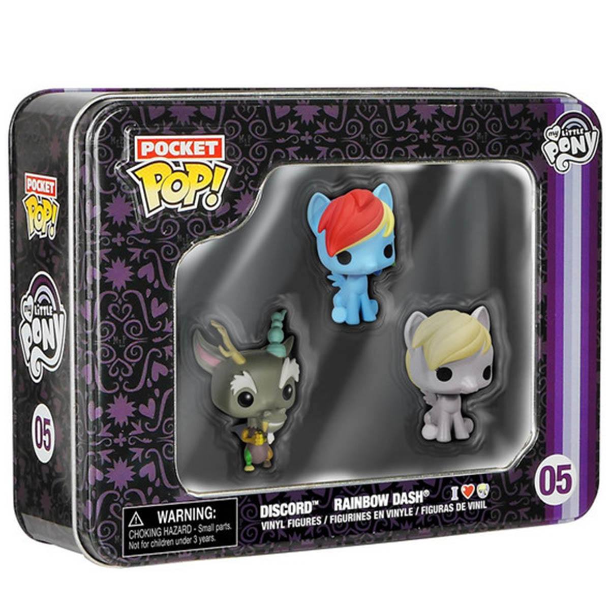 This is the My Little Pony Pocket POP vinyl 3 pack produced by Funko. The My Little Pony Pocket POP 3 pack features Rainbow Dash, Discord, and Derpy. The Funko Pocket POP miniatures are really cool and MLP fans have been super excited for them, and they've sold well. Very cool.