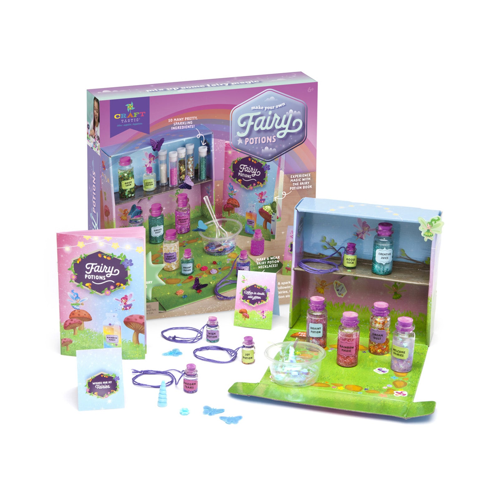 Mix up a good luck potion, one that changes the color of flowers, and more following simple recipes written by fairies. Add a pinch of glitter for that extra sparkle! And since no enchantress is complete without her magic necklace, this kit includes enough material to make four of them. Store it all in a special cabinet!