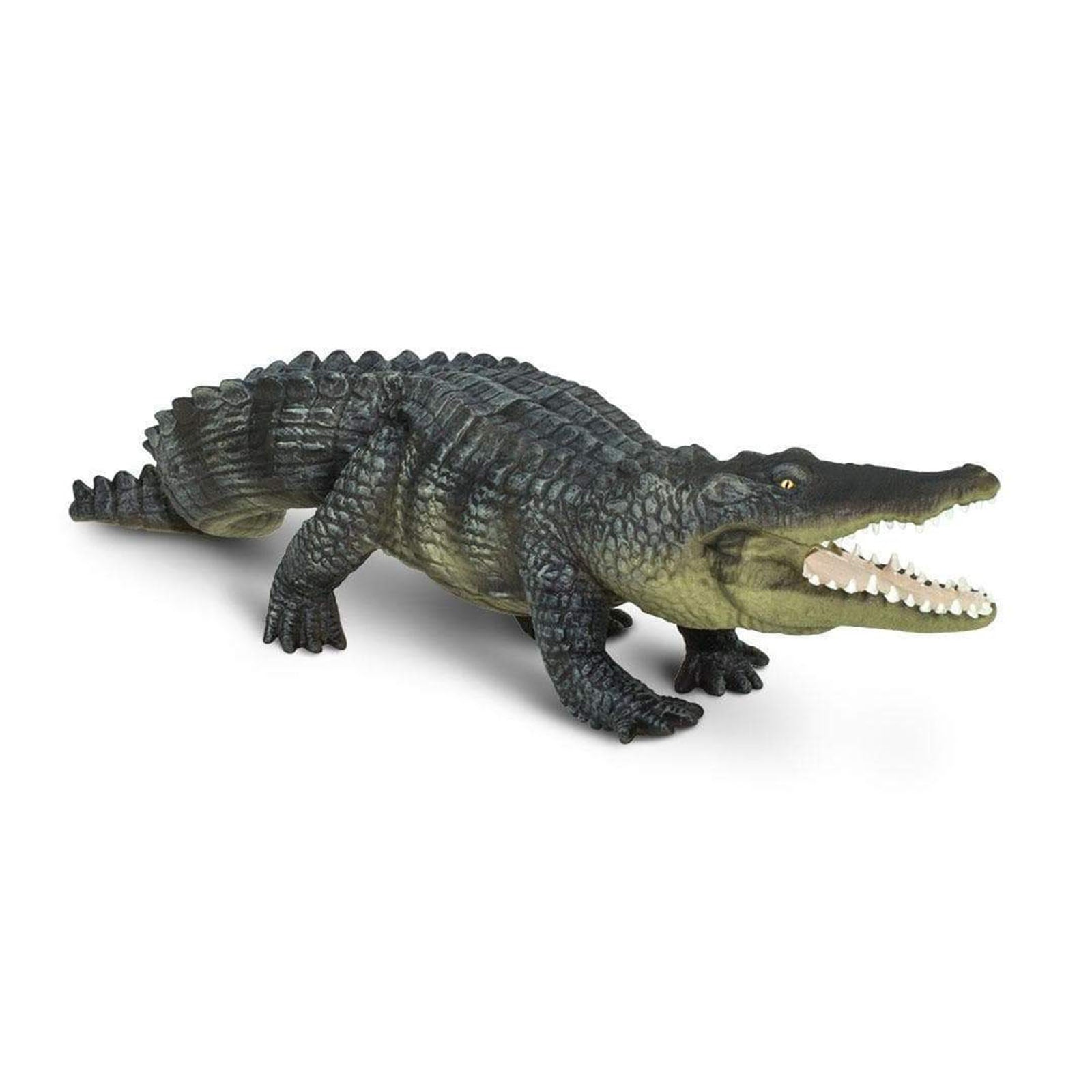 The figure features a lifelike texture and precise detailing that makes it look as if it has just emerged from the murky waters of a riverbank. One can almost feel the roughness of the crocodile's skin, with its sharp scales and prominent ridges running from head to tail. The figure also features an open mouth to show its ferocious teeth and tongue, as well as its beady eyes that seem to be always watching.