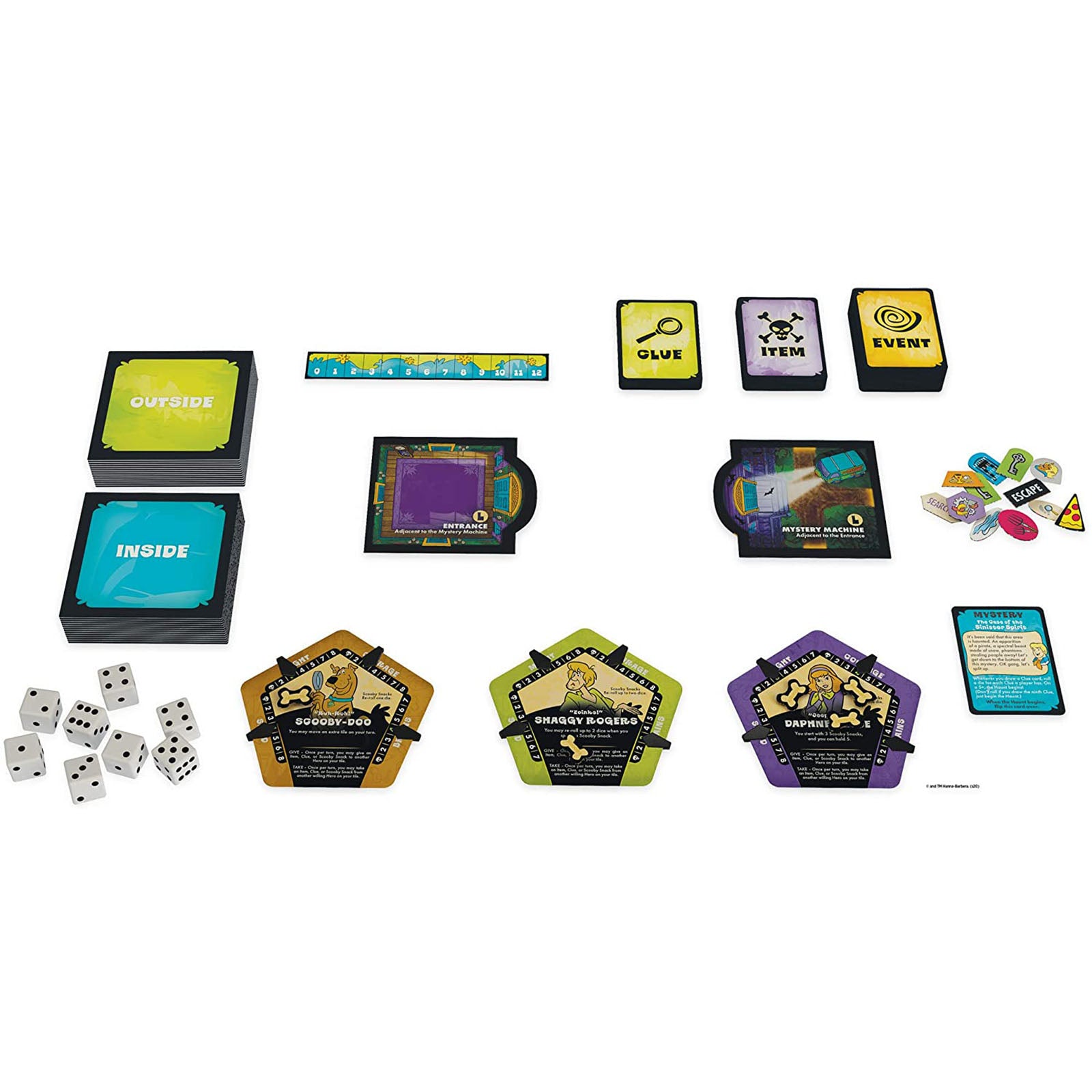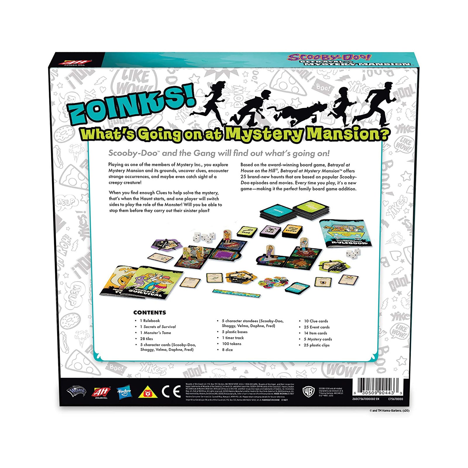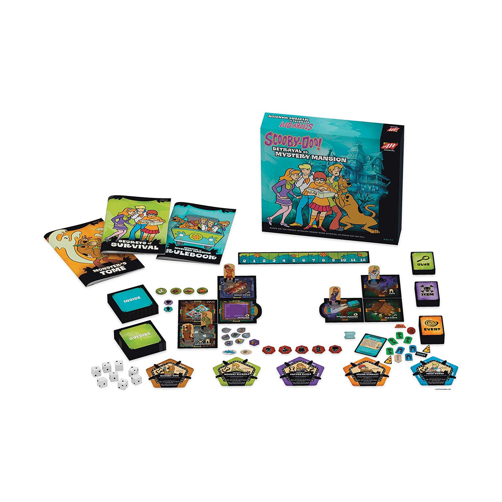 Includes 1 Rulebook, 1 Secrets of Survival, 1 Monster's Tome, 28 Tiles, 5 Character Cards, 5 Character Standees, 5 Plastic Bases, 1 Timer Track, 100 Tokens, 8 Dice, 10 Clue Cards, 25 Event Cards, 14 Item Cards, 5 Mystery Cards, 25 Plastic Clips.