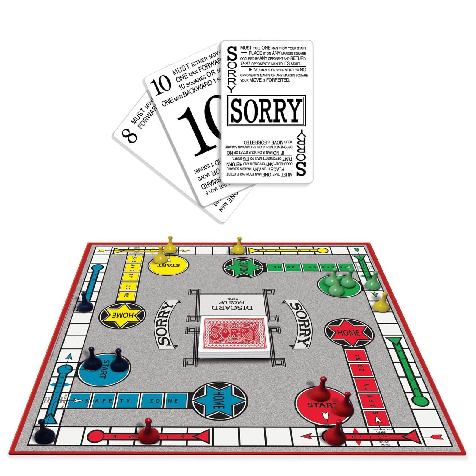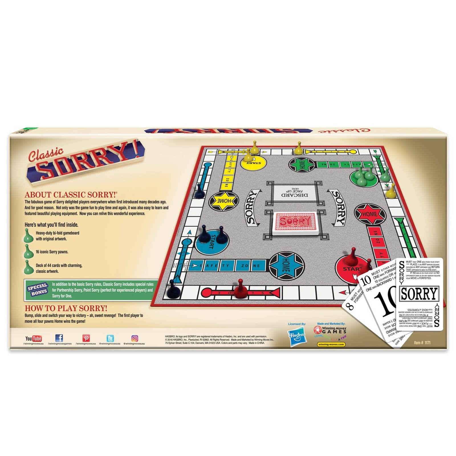 This edition of sorry is based on the classic game made by the Parker Brothers. Includes heavy duty bifold gameboard with original artwork, 16 iconic sorry pawns, deck of 44 cards, and rules. As a bonus includes rules for Partnership Sorry, Point Sorry, and Sorry for One.