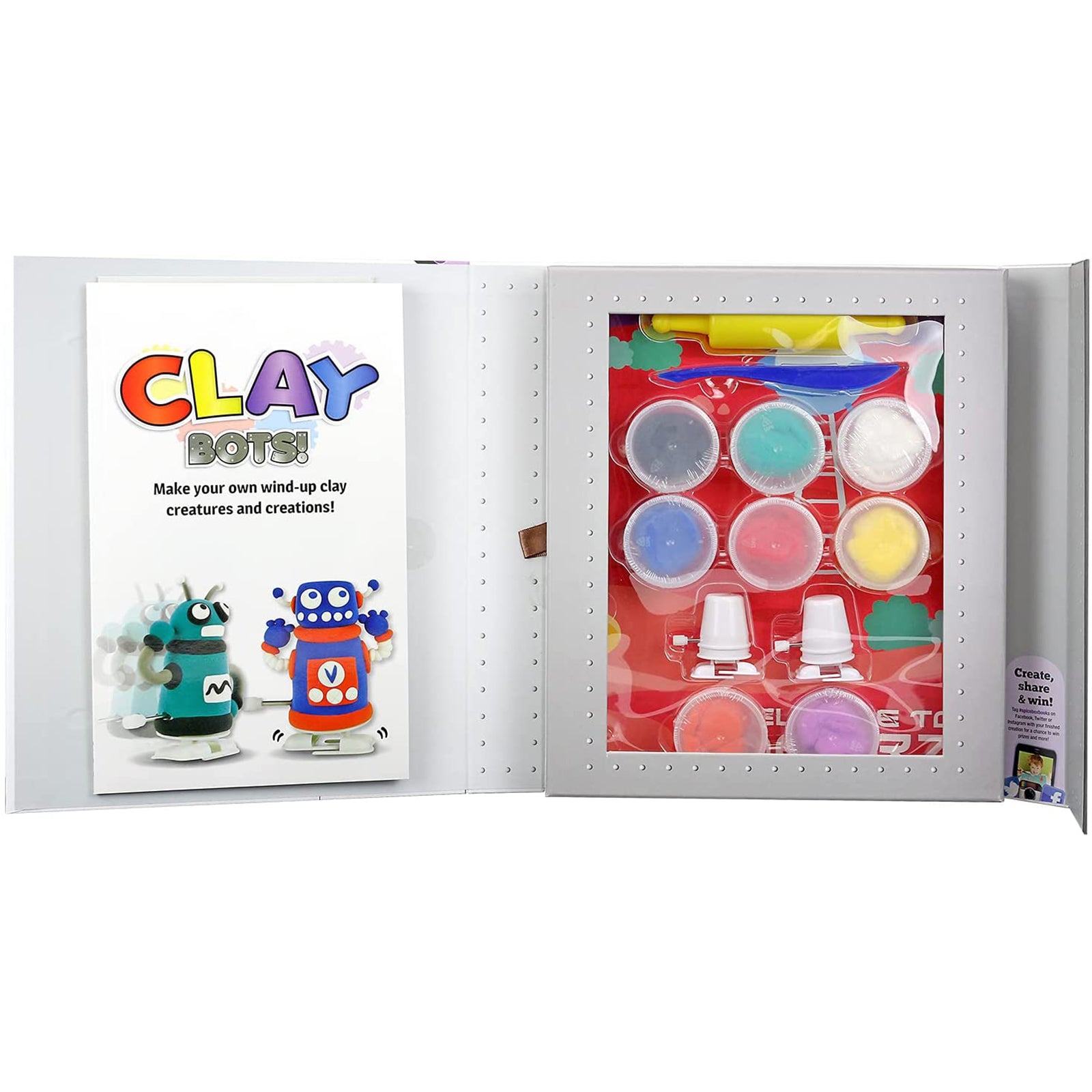This kit includes an instruction book, 8 containers of non-toxic, air-drying clay, 2 sets of wind-up feet, 3 sculpting tools, rolling pin, and 2 foldable play scenes.
