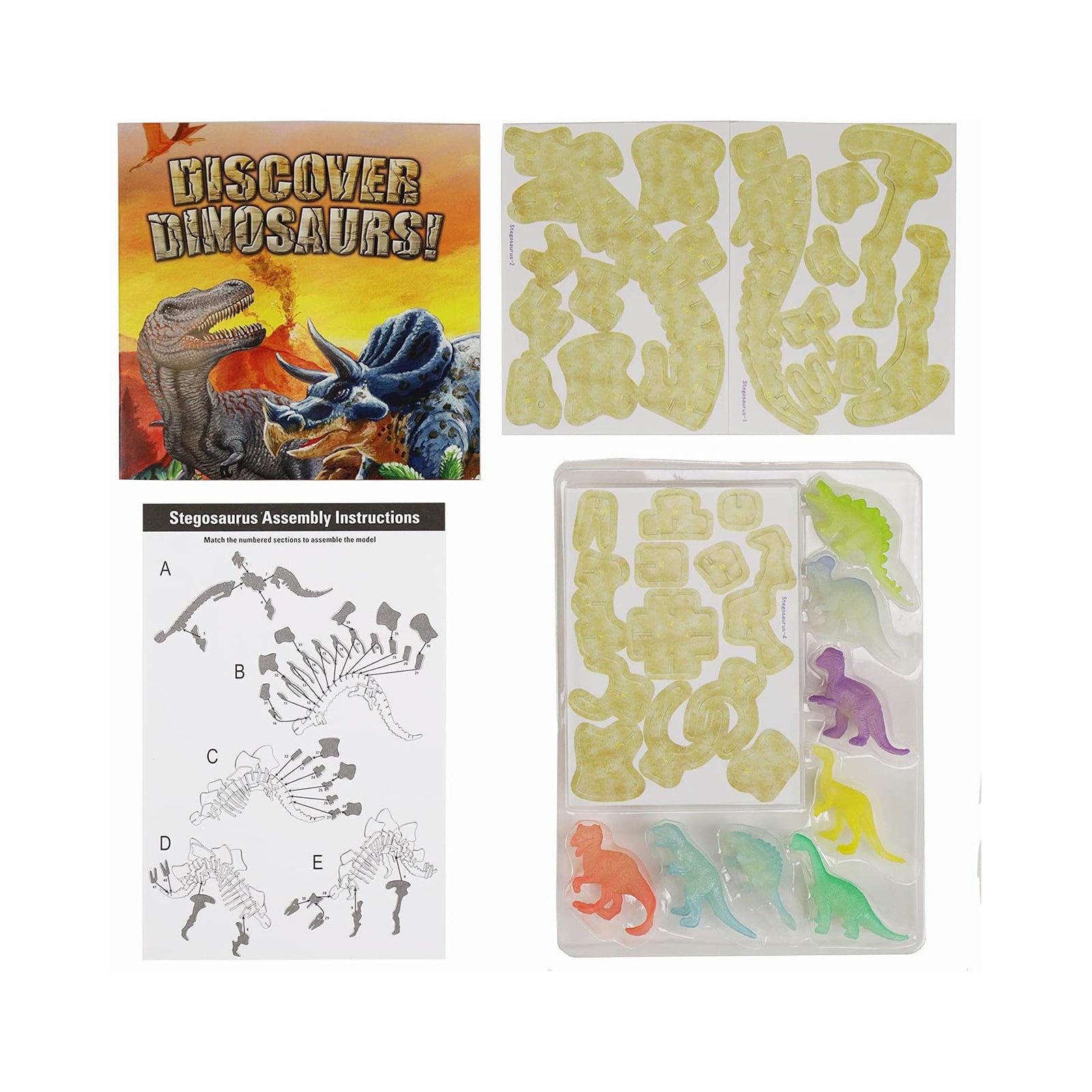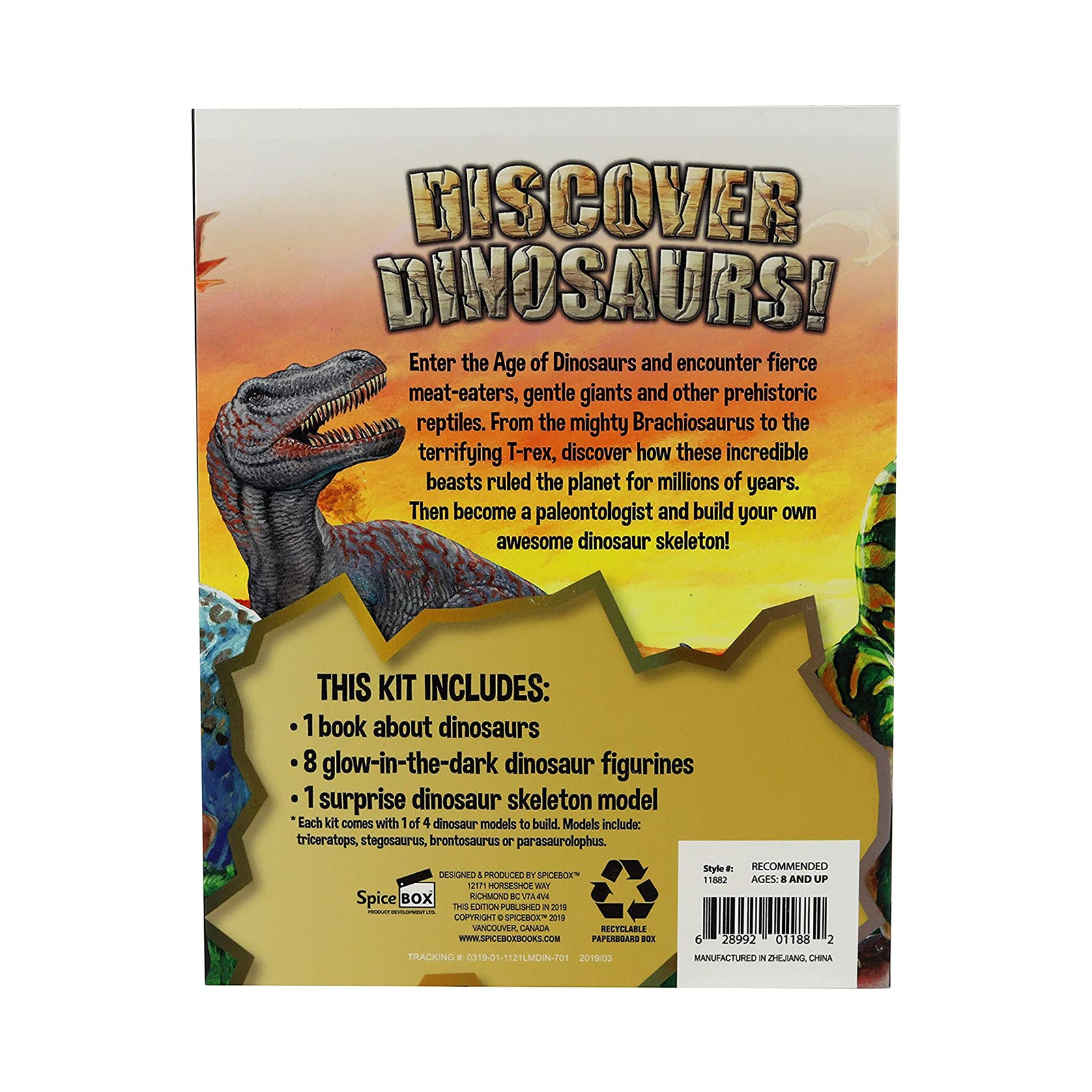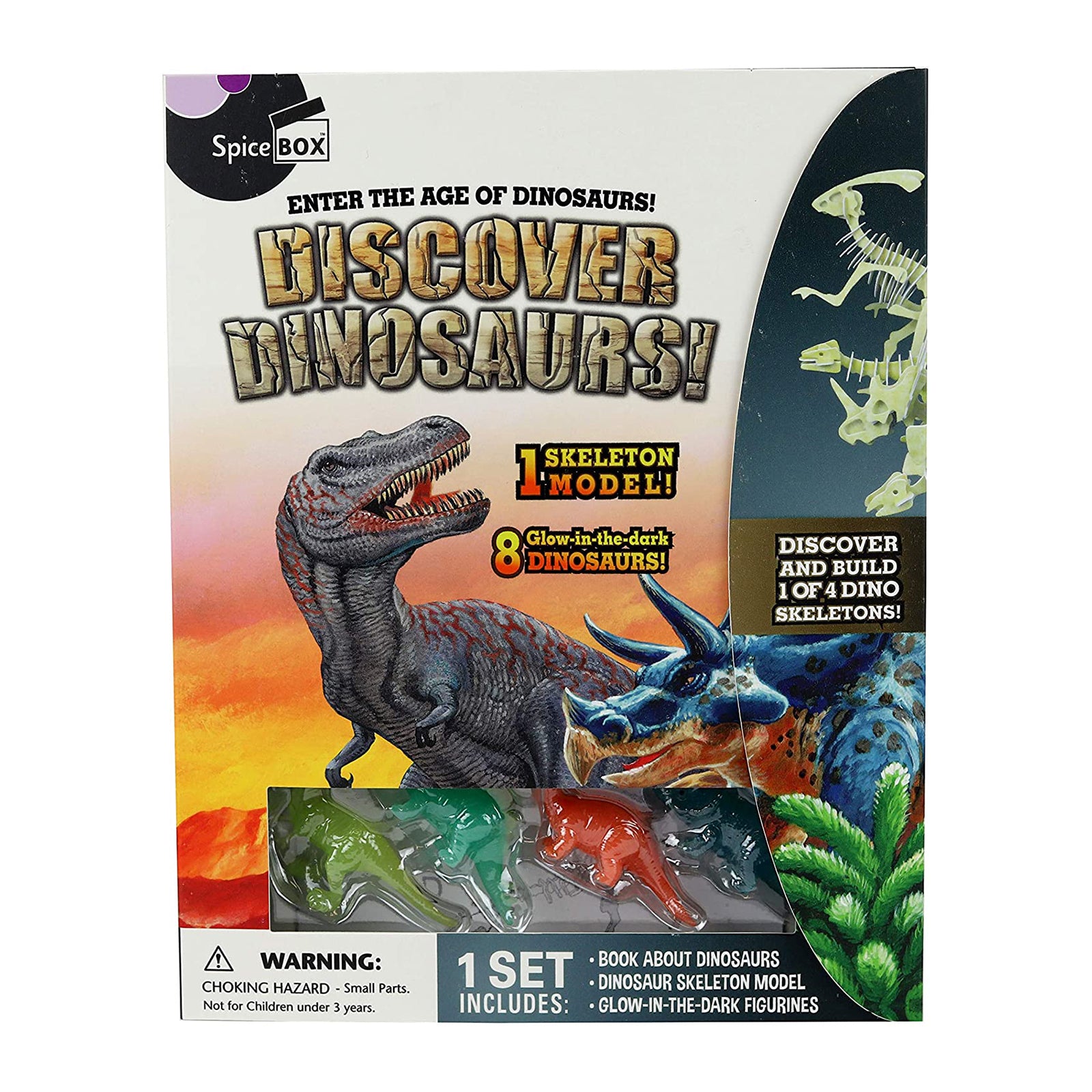 This kit includes a book of about dinosaurs, 8 glow in the dark dinosaur figurines, and 1 surprise dinosaur skeleton model.