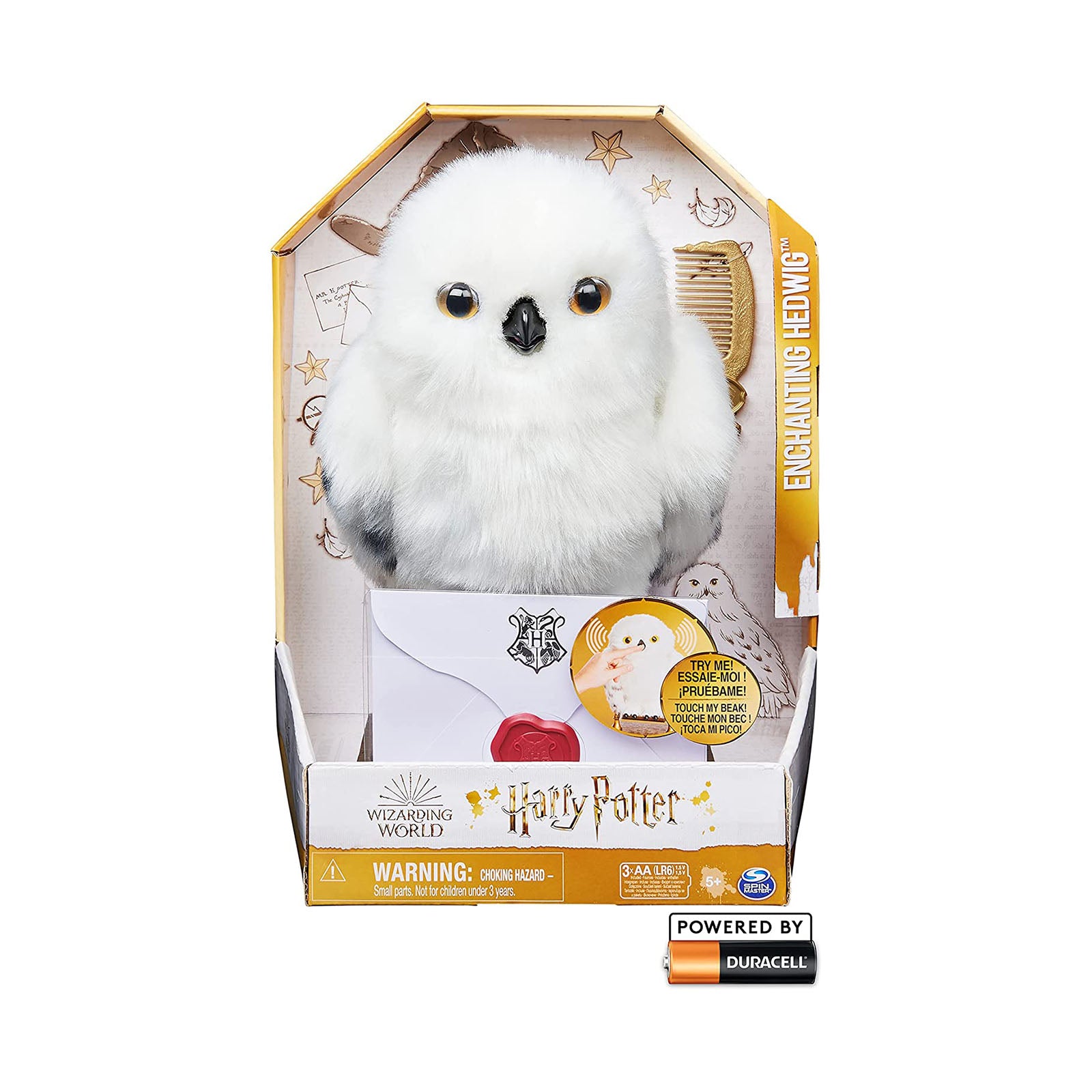 Recreate your favorite Harry Potter scenes with the Wizarding World Enchanting Hedwig! Featuring over 15 realistic sounds and movements and super soft plush material, Enchanting Hedwig brings the iconic Harry Potter owl to life. Remove Hedwig from her perch and discover all of her magical features. Hedwig loves to be pet! With “ruffle detection,” she can sense which way you are petting her. For loving chirps and head movements, pet her from front to back – she doesn’t like having her feathers ruffled backwards and will let you know how she feels about it! Place your finger in her beak and she’ll playfully nibble on it when she’s happy! Enchanting Hedwig also recognizes your tone of voice. When you speak soft and gently, she’ll respond with a hoot to show you that she is listening.