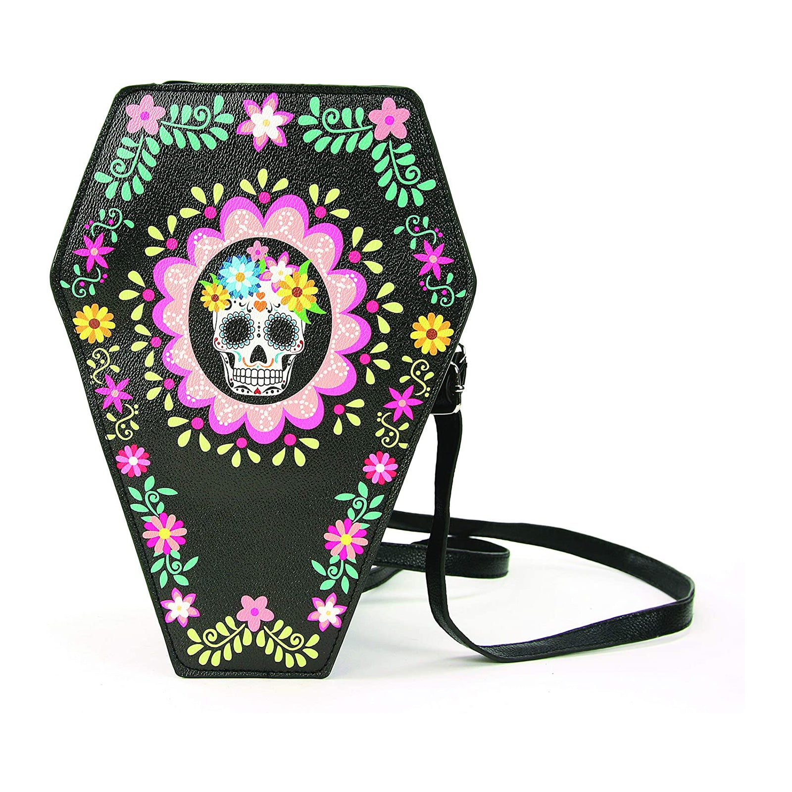 This is a Sugar Skull Coffin Convertible Black Crossbody Bag Backpack made by the awesome people over at Comeco.