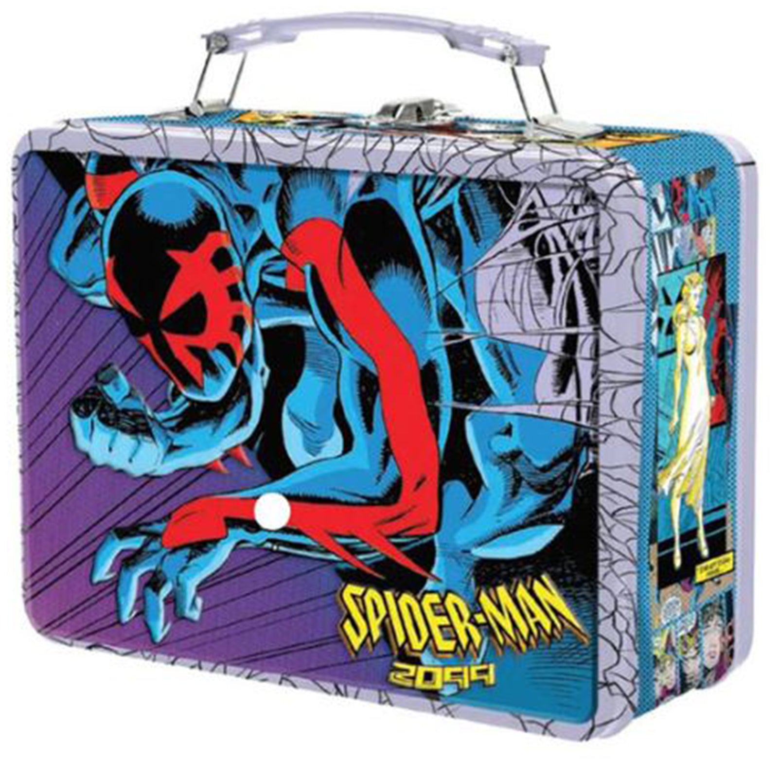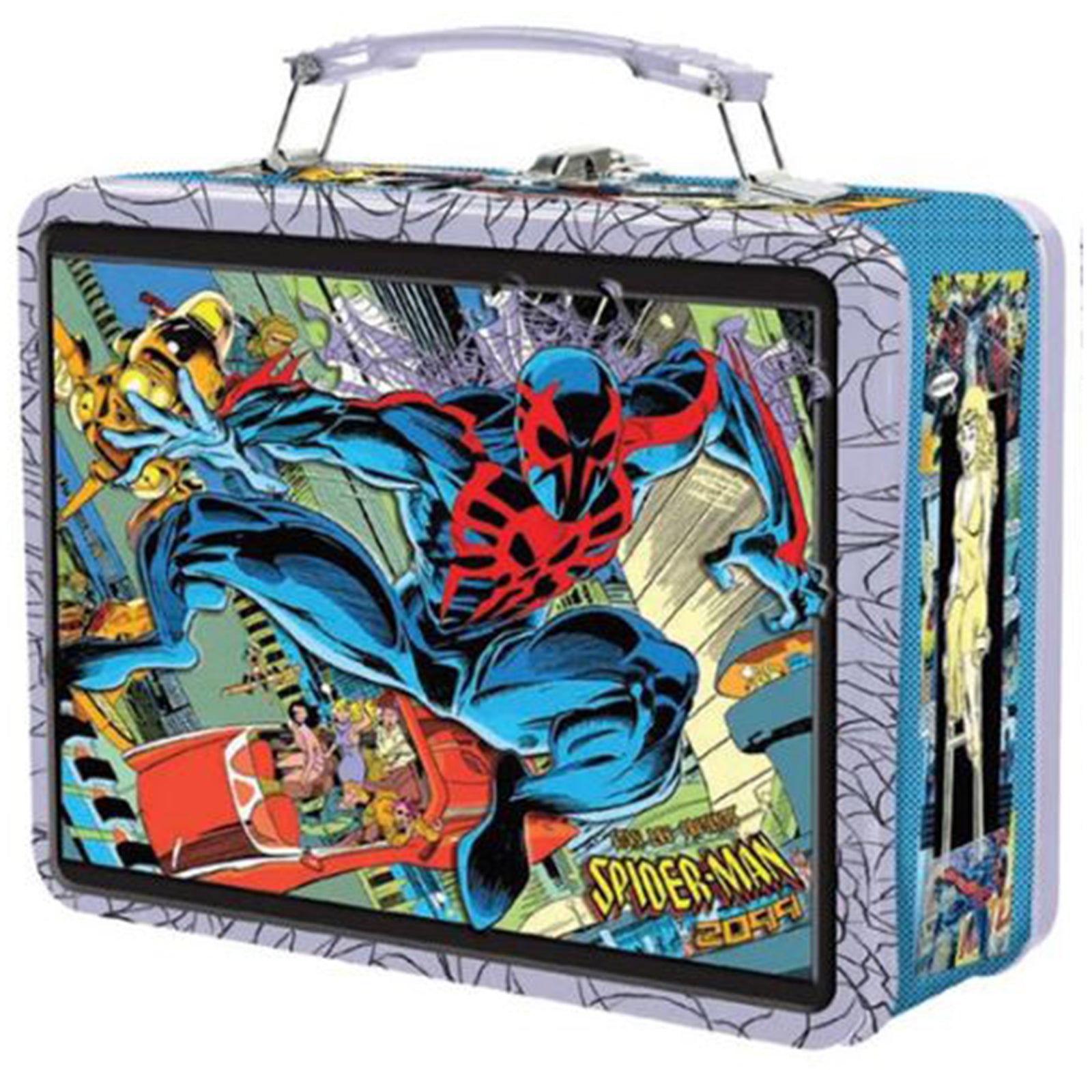 The lunch box features a vibrant design showcasing Spider-Man 2099 in action, with bold colors and dynamic graphics that capture the essence of the futuristic superhero.
