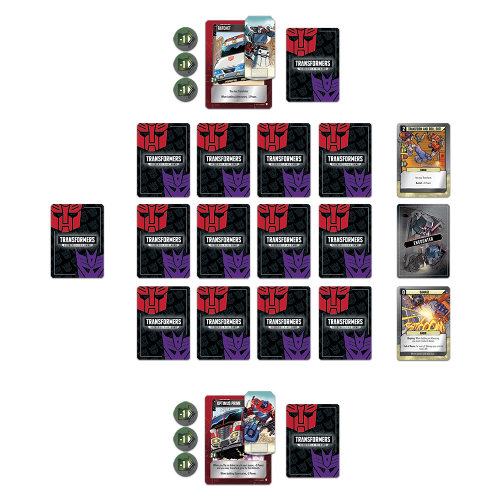 Contents: 50 Starter Cards, 36 Basic Cards, 85 Main Deck Cards, 6 Decepticon Boss Cards, 10 Encounter Cards, 5 Reference Cards, 6 Oversized Character Cards, 15 Tracking Tokens, 8 Reminder Tokens, 40 Victory Point Tokens, 50 Energon Cubes, and Rulebook
