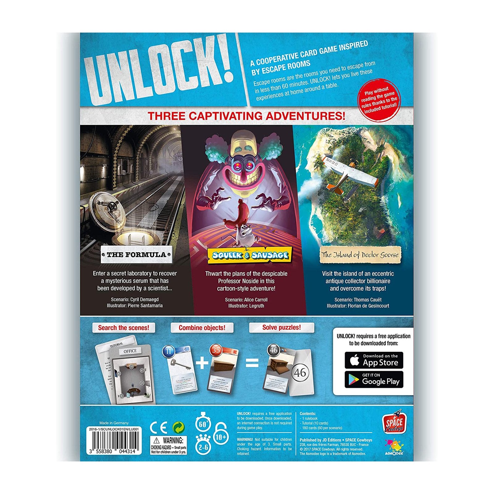 A cooperative card game inspired by escape rooms. Escape rooms are the rooms you need to escape from in less than 60 minutes. UNLOCK! lets you live these experience at home around a table.