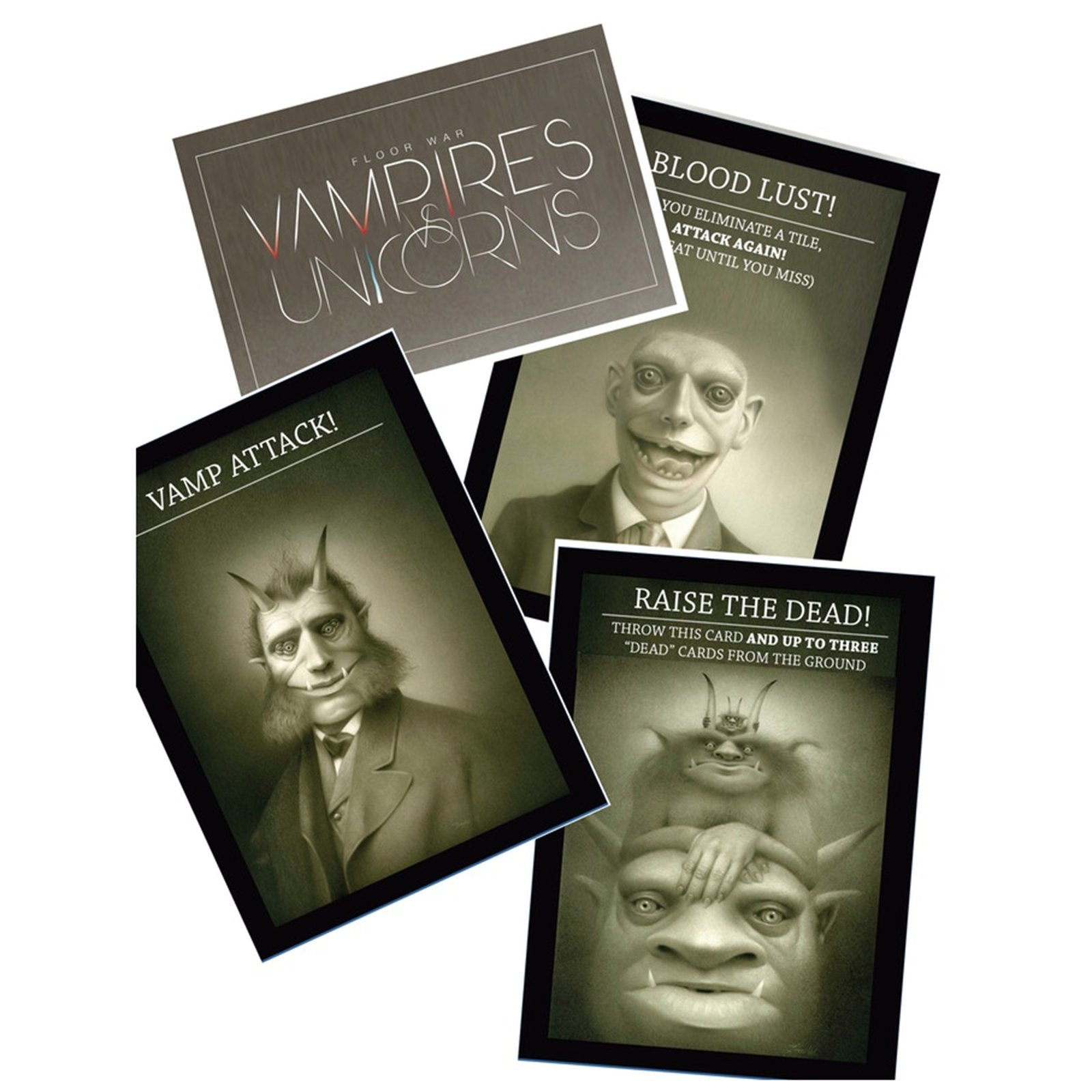 Vampires Vs Unicorns Floor War is a hilariously fun THROWING CARD game with unexpected results, featuring fantastic hand-painted tile art by Travis Lampe and Travis Louie suitable for framing.