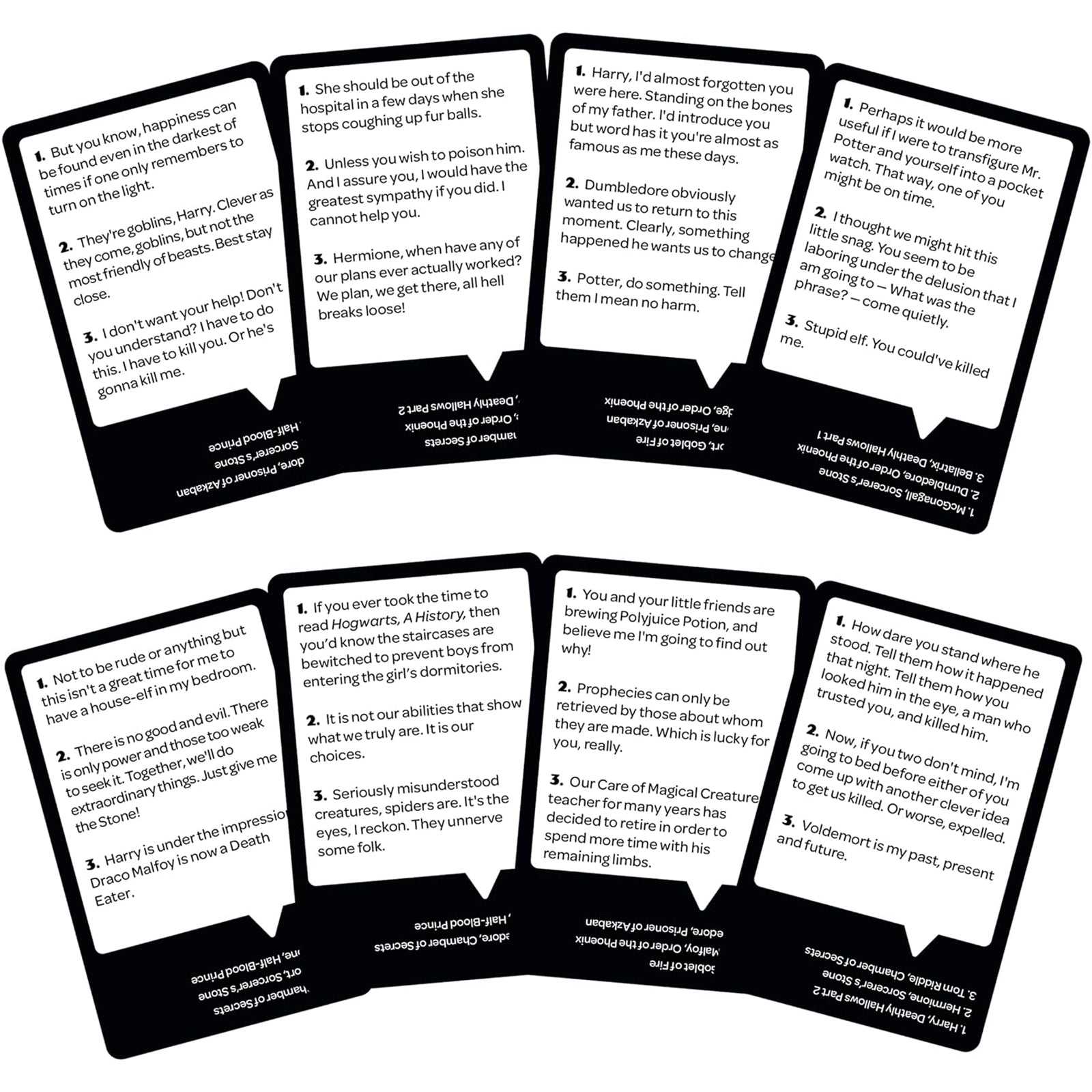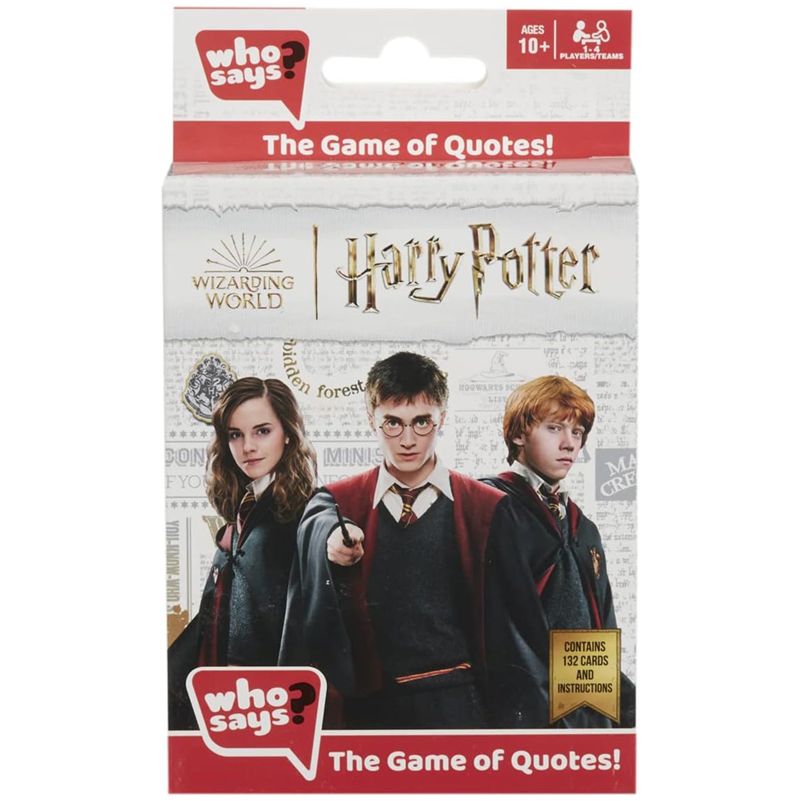 The Who Says Harry Potter Game of Quotes Trivia Game is a magical journey through the beloved wizarding world of Harry Potter. Tailored for fans of the series, this captivating game challenges players' knowledge of iconic quotes from the enchanting characters of Hogwarts. With a mix of spellbinding, nostalgic, and pivotal lines, players compete to match quotes with the right character, testing their recollection of the series' rich dialogue. Whether played with fellow Potterheads or family, this game promises delightful moments and endless fun, capturing the essence and enchantment of the Harry Potter universe.